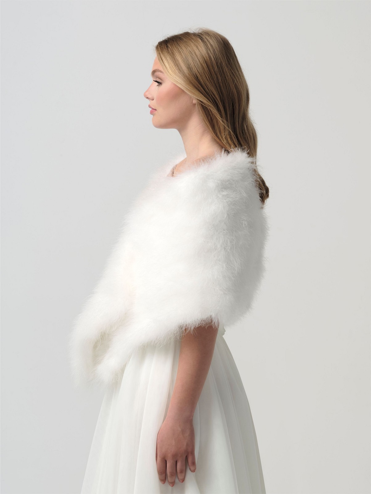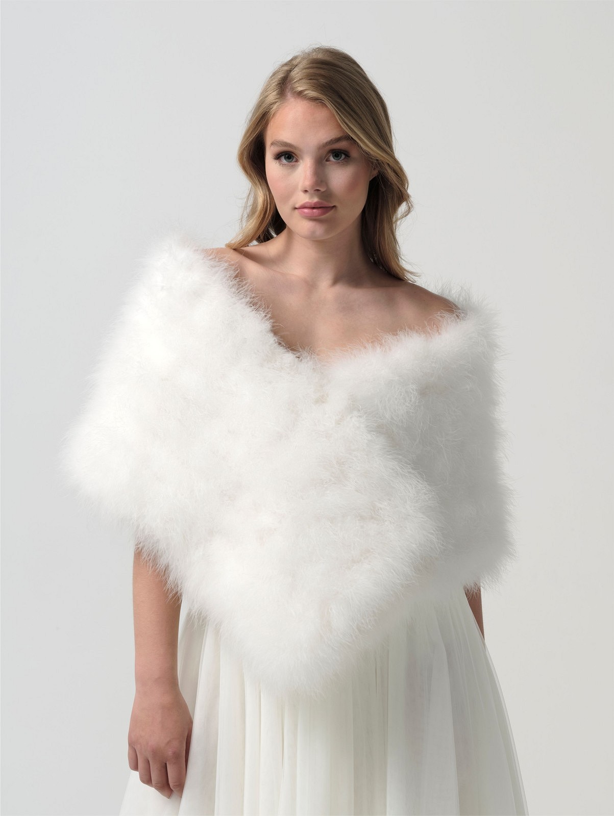 White uni size bolero jacket made out of marabou feathers, with satin lining & a clip closure mid-front. Measurements: 150 x 32 cm (59 x 12.6 inch). Can be used in a variety of different ways.