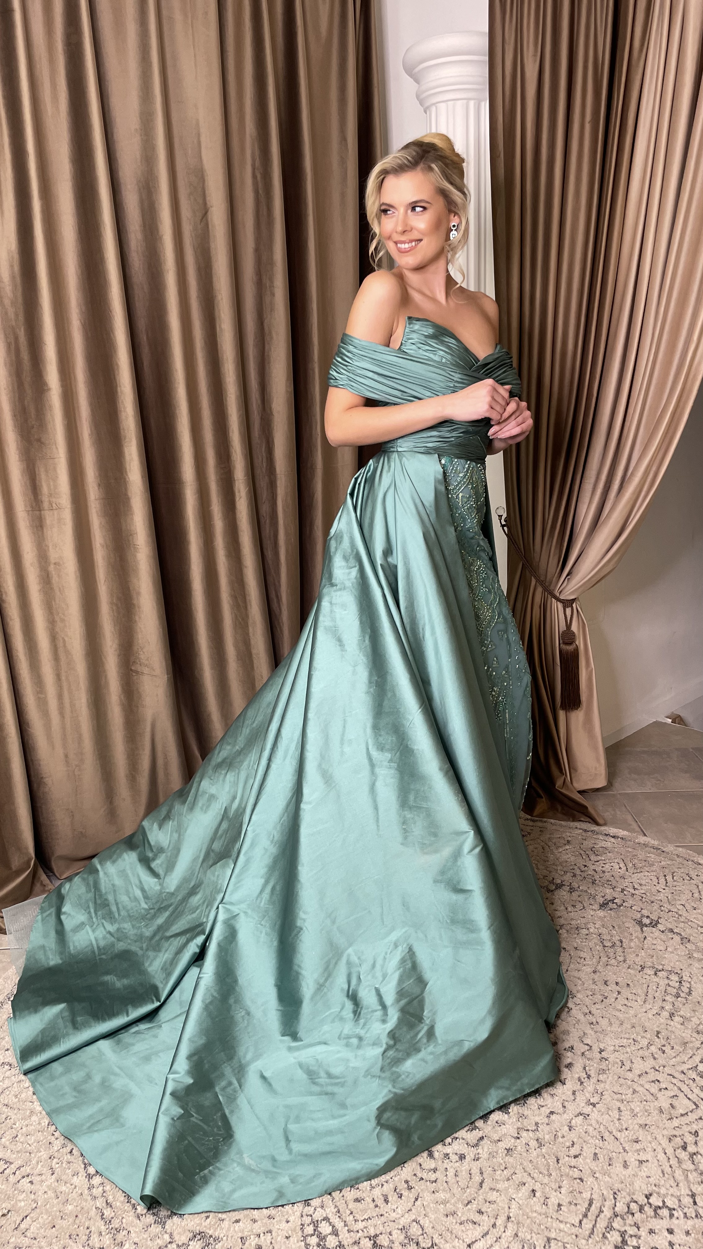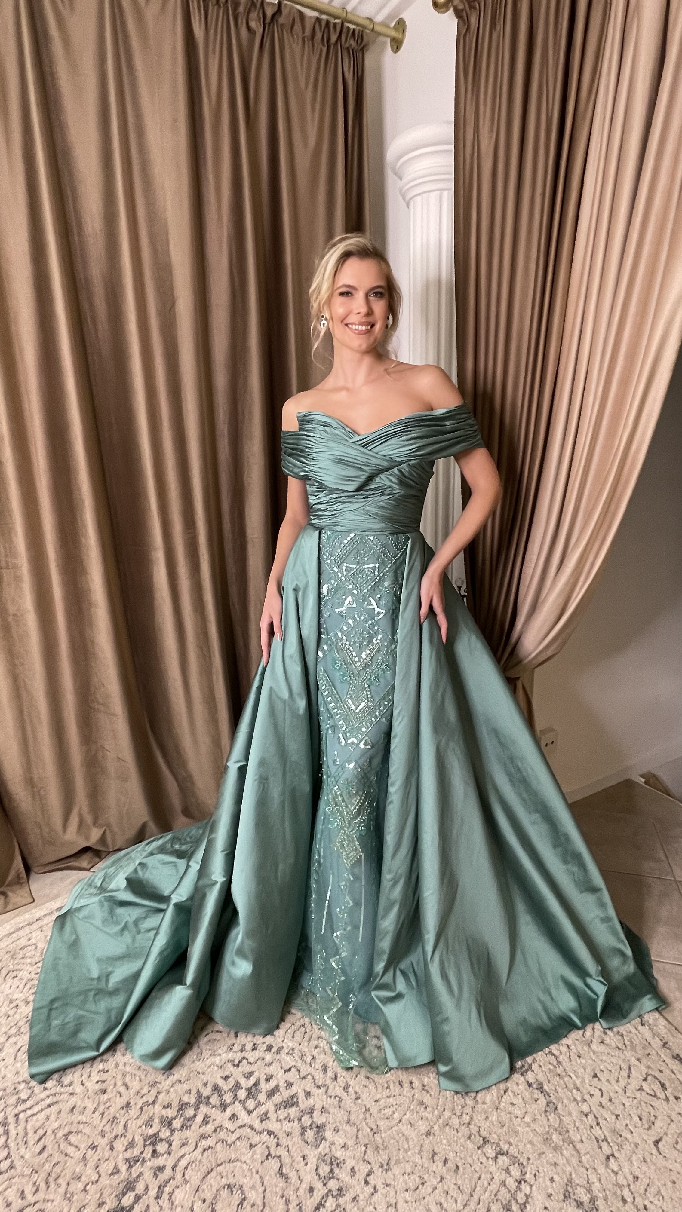 Ein hervorstechendes Merkmal dieses eleganten Abendkleides ist der abnehmbare Schleppe. Die zweite Schicht des Kleides besteht aus einem luxuriösen Stoff, der einen sanften, eleganten Schleppe bildet. Dies ermöglicht es Ihnen, das Kleid ganz nach Ihrem Wunsch anzupassen. Der Schleppe kann bei Bedarf einfach entfernt werden, sodass Sie zwischen einem klassischen langen Abendkleid und einem eleganten Cocktailkleid wählen können. Diese Vielseitigkeit macht das Kleid zu einer hervorragenden Wahl für verschiedene Veranstaltungen. Elegantes Abendkleid