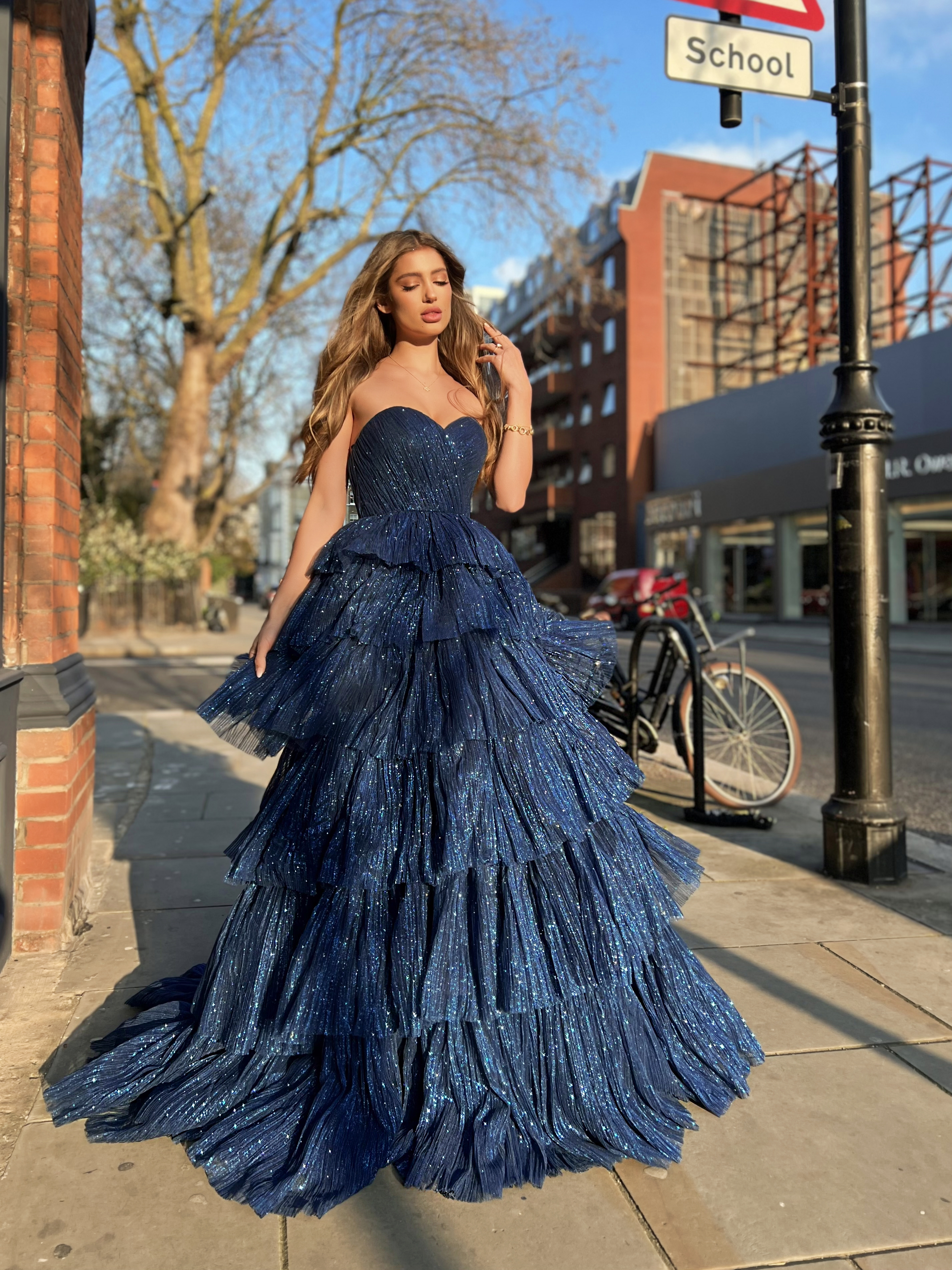 Fühlen Sie sich wie eine Prinzessin in diesem flauschigen, voluminösen navyfarbenen Ballkleid. Der geschichtete Tüllrock erzeugt einen dramatischen Effekt, perfekt für einen unvergesslichen Auftritt. Das bestickte Oberteil fügt genau die richtige Menge an Glitzer hinzu. Besuchen Sie Kleidergeschäfte in Wien, um dieses atemberaubende Kleid zu finden und in die verzauberte Welt des Ballsaal-Glamours einzutauchen.