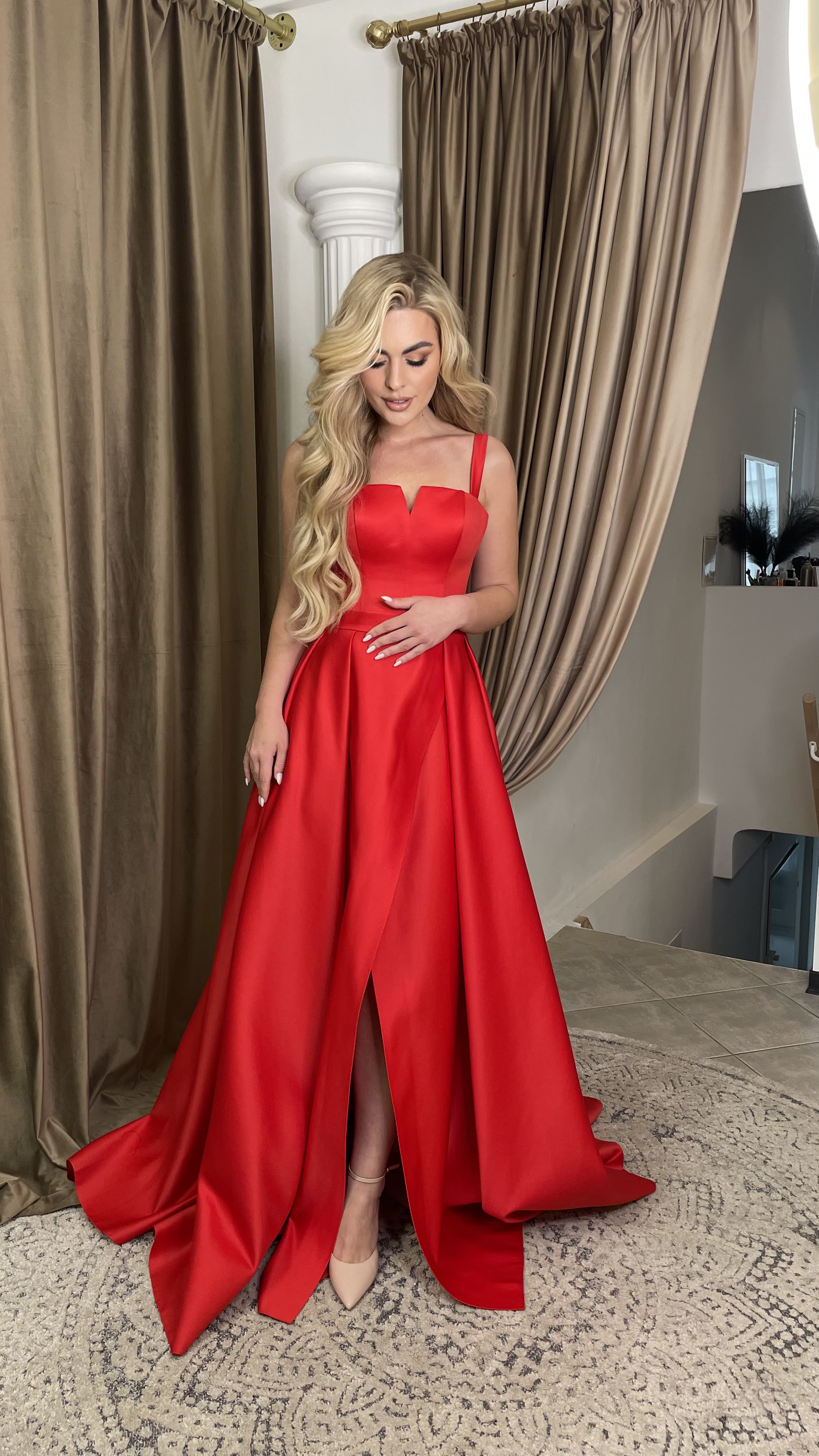 Der dezente, aber elegante Beinschlitz dieses roten Abendkleides verleiht dem klassischen Design einen Hauch von Modernität und sorgt gleichzeitig für Bewegungsfreiheit. Der Schlitz betont Ihre Beine auf raffinierte Weise, ohne dabei die klassische Note des Kleides zu beeinträchtigen. Es ist die perfekte Balance zwischen zeitloser Eleganz und einem verführerischen Detail, das dem Kleid einen einzigartigen Charakter verleiht.